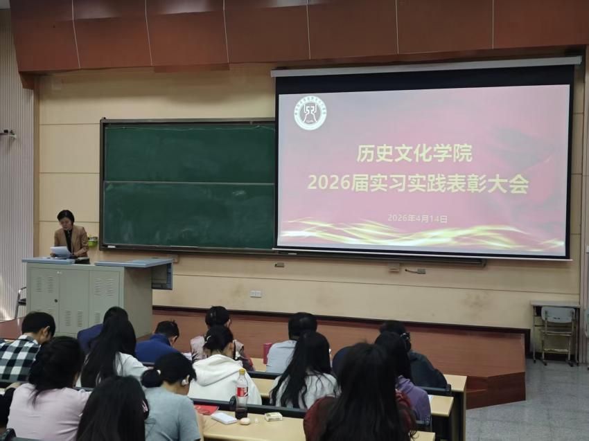为表彰先进、树立典范,总结实习实践成果,引导学子深化专业认知、提升综合素养,2026 年 4 月 14 日下午,历史文化学院 2026 届毕业生实习表彰大会在文汇楼 A101 教室隆重举行。学院党委书记刘洪、院长牛巧红出席大会,大会由副院长郭少华主持,2026 届毕业生实习指导教师、2023 级历史学专业、2023 级文物与博物馆学专业及 2024 级文化产业管理专业全体学生共同参会。