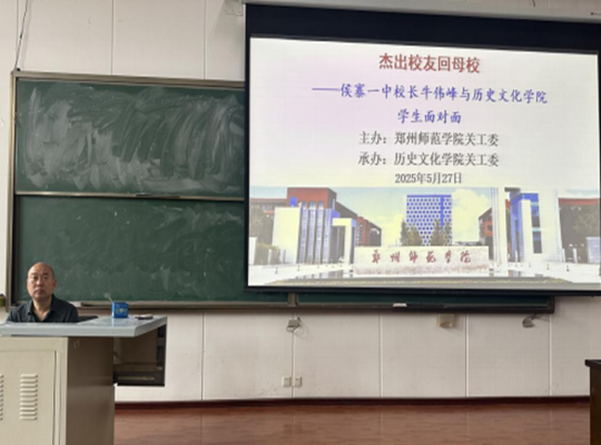 为深入落实立德树人根本任务,充分发挥校友协同育人作用,在学校关工委的大力支持下,历史文化学院关工委于2025年5月27日在文汇楼D234举办“杰出校友回母校——侯寨一中校长牛伟锋与历史文化学院学生面对面”座谈会。本次活动聚焦助力师范生职业规划、破解毕业实习难题,以榜样力量引领青年学子成长。