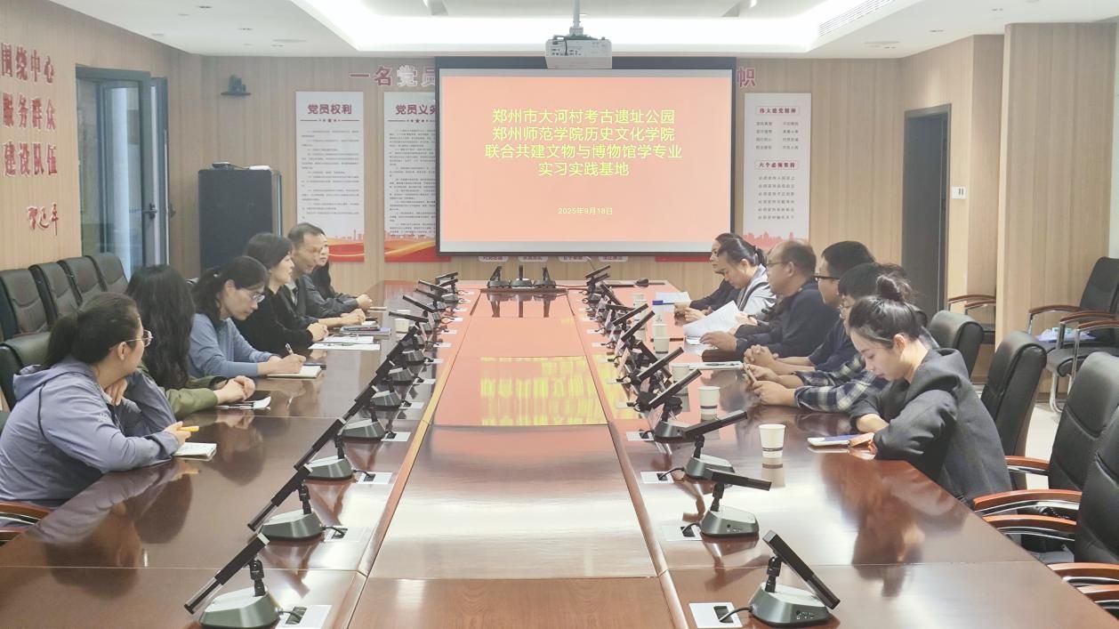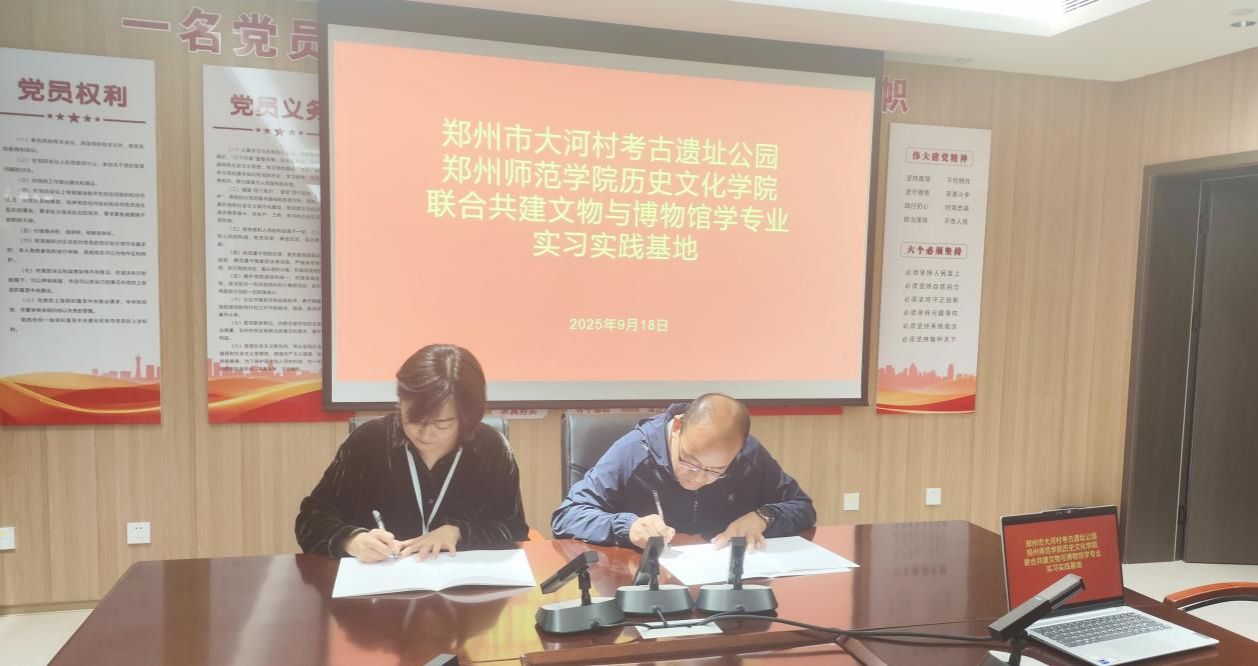 9月18日下午,郑州师范学院历史文化学院与郑州市大河村考古遗址公园共建文物与博物馆学专业实习实践基地签约暨揭牌仪式在大河村考古遗址公园顺利举行。我院党委书记郑琪、院长甘浩等一行出席活动,与郑州市大河村考古遗址公园党支部书记、主任朱璇共同签订共建协议,并为实习实践基地揭牌。