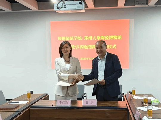经交流,双方首先启动了"郑州师范学院教学实践基地"授牌仪式,并就多个方面深度开展校馆合作达成共识。我校历史文化学院院长甘浩与郑州大象陶瓷博物馆副馆长李红新,共同签署了校馆合作协议。