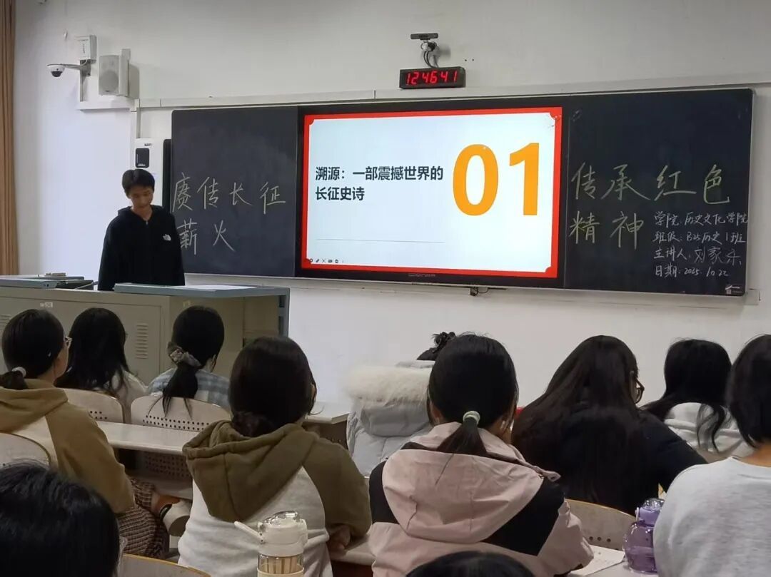我院于10月22日在文汇楼开展“赓续长征薪火,传承红色精神”政治学习。本次政治学习由B25历史学一班刘家乐、B25历史学二班解佳佳、B25文物与博物馆学班多明凯担任主讲人,25级全体同学积极参与。
