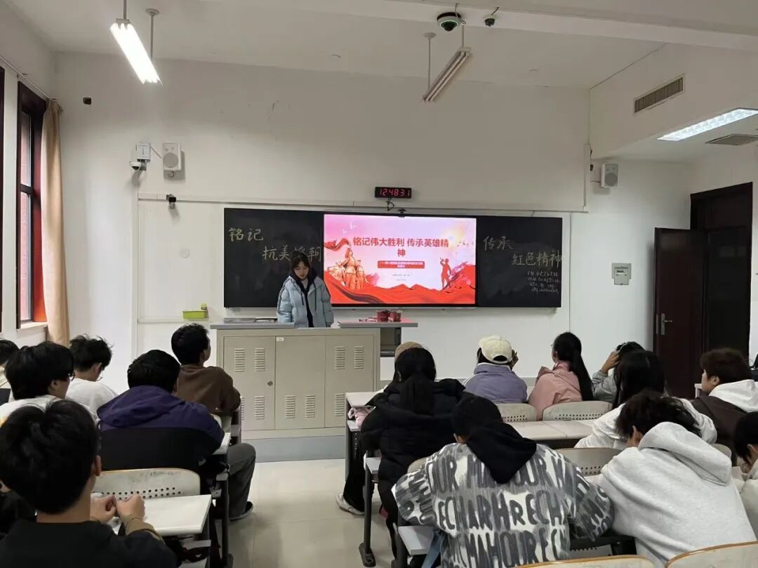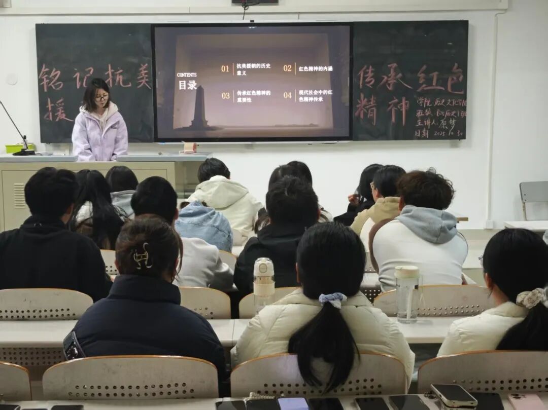 我院于10月30日在文汇楼开展“铭记抗美援朝,传承红色精神”主题团课。此次团课由B25历史学一班原梦,B25历史学二班赵一琳,B25文物与博物馆鲁文雯三位同学担任主讲人,25级全体学生踊跃参与。