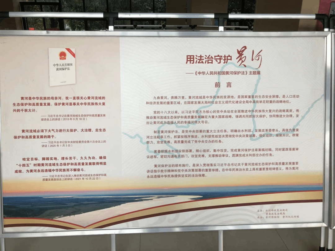 据悉,“用法治守护黄河 ——《中华人民共和国黄河保护法》主题展” 将持续至 2025 年 10 月中旬。现诚邀全校师生前往文博楼一楼大厅参观,在沉浸式学习中感受法治力量与黄河文化的交融魅力,共同为守护母亲河、传承黄河文化凝聚共识与行动。