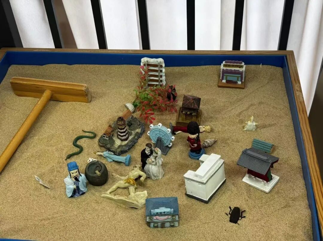 然后,同学们在雷锋补给站完成了一件沙盘作品。沙盘上陈列着丰富多样的模型,既有穿古装的人物、新婚夫妇等人物形象,也有中式传统建筑、普通房屋等建筑模型,还包含蛇、昆虫、兔子等动植物造型,充满了想象力与创意。