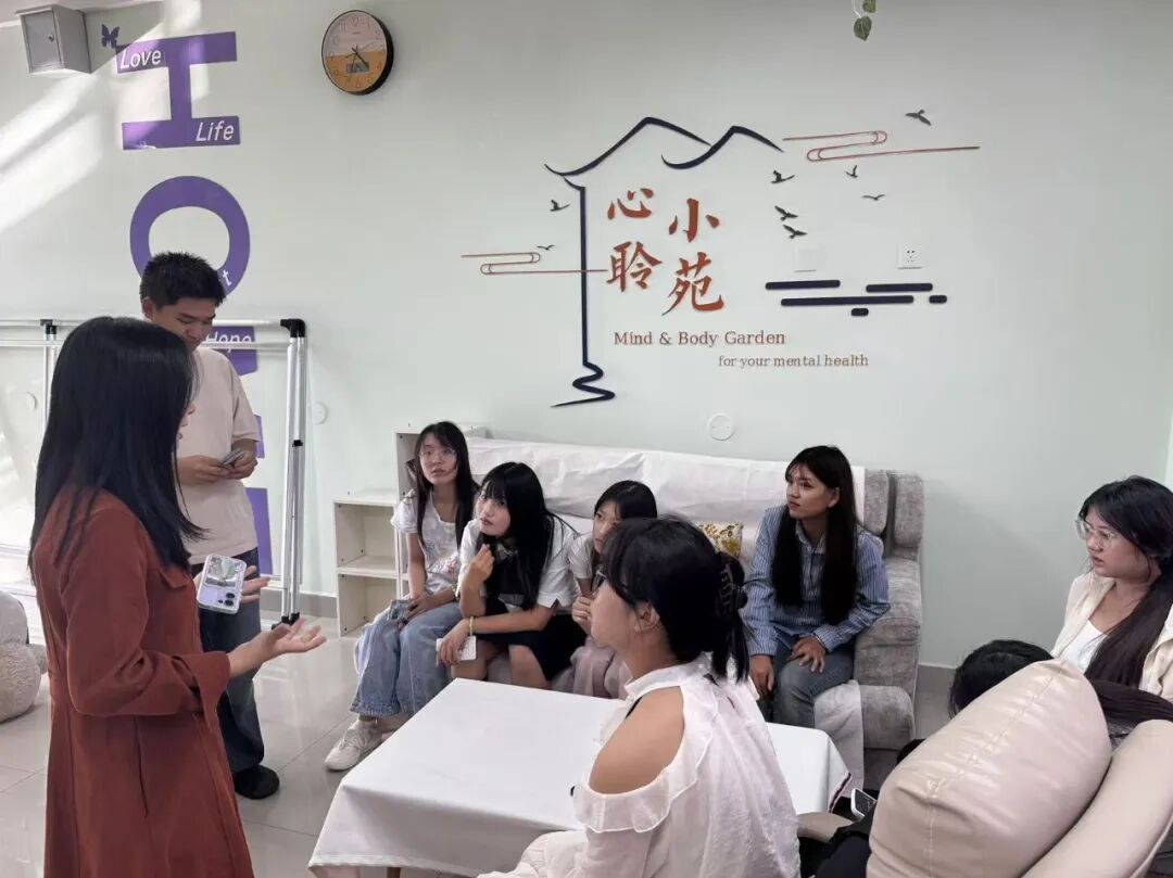 活动负责人向围坐的参与者们讲解本次活动的意义,同学们专注聆听,并不时展开积极讨论。温馨布置的场地营造出舒适放松的氛围,有效帮助大家缓解心理压力。